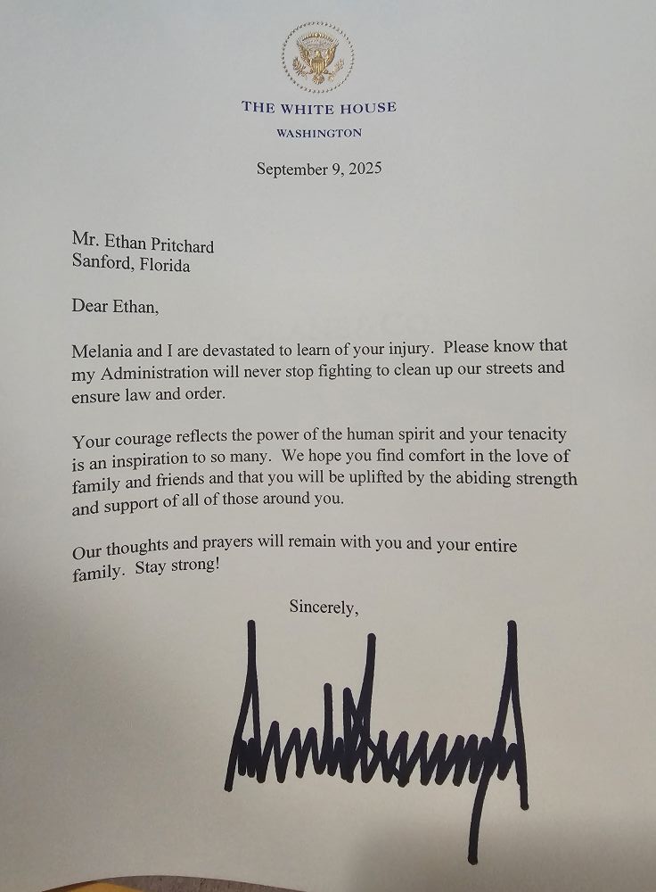 Ethan Pritchard, a freshman FSU football player who was shot in Havana last August, received a signed letter from President Donald Trump as he continues his recovery in the hospital.
