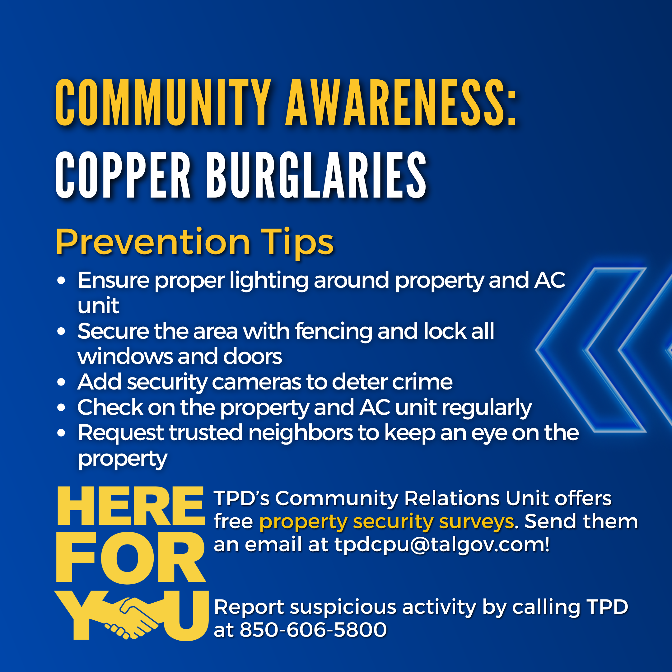 The Tallahassee Police Department said the agency has not noticed an uptick in copper thefts.