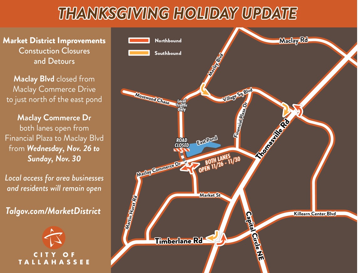 The City of Tallahassee is temporarily opening Maclay Commerce Drive to Financial Plaza to Maclay Boulevard for the Thanksgiving holiday as businesses in the Market District prepare for Black Friday sales.